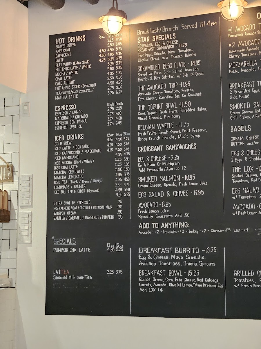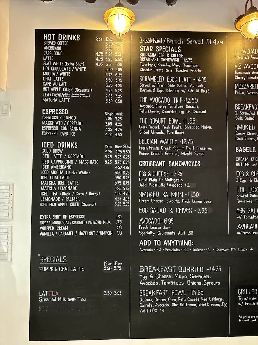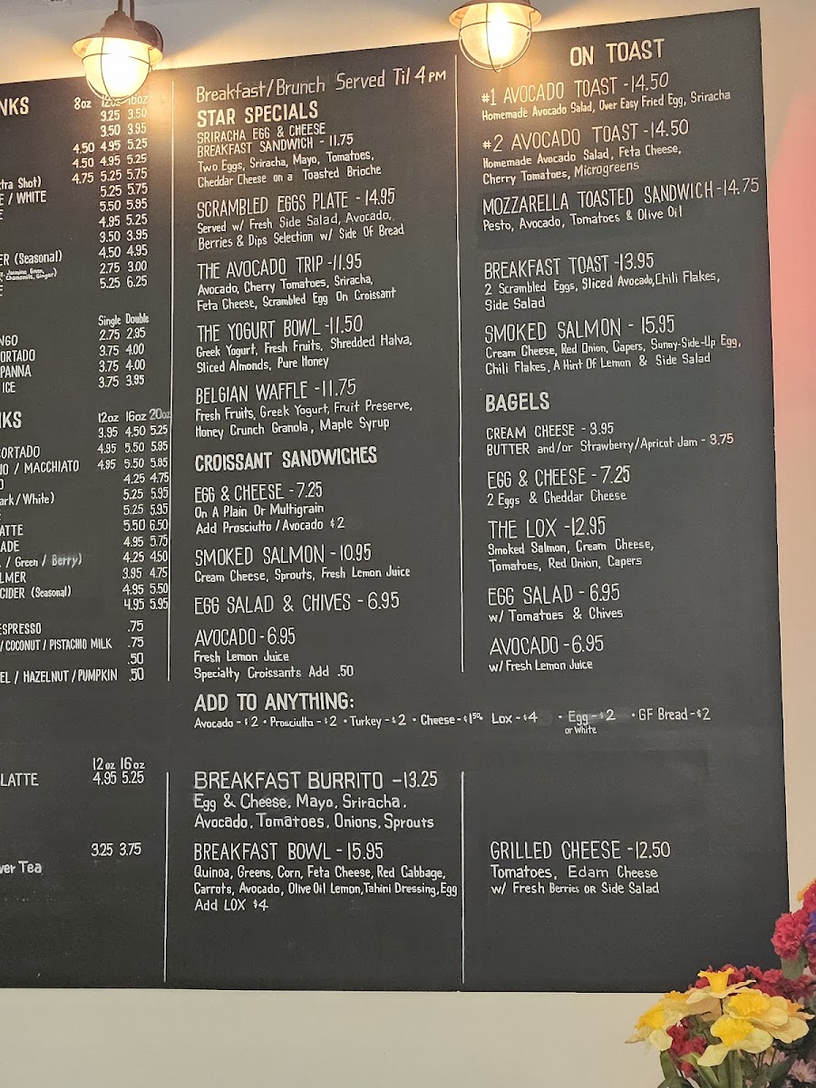 Black Star's menu shines with a variety of baked goods, including their popular Bagels. You'll want to try their The Lox Bagel ($13.95) for a taste explosion featuring smoked salmon, cream cheese, tomatoes, red onions, and capers, or for a classic option, go for the Egg and Cheese Bagel ($7.50) – simple, satisfying, and done just right. For those craving something crispy, don’t miss their Ham and Cheese Croissant ($8.50) or Turkey Pesto Croissant ($9.25), both filled with rich flavors that will make every bite feel like a special occasion.